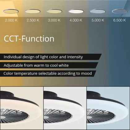 Le Brilliant Salerno Ventilateur Plastique Métal Noir 36W 4700lm - 830-865 CCT+RGB | 485mm - Télécommande Dimmable doté d’un culot se distingue par les points suivants. La température de couleur de Kelvin, laquelle vous permettra de fournir une lumière de qualité et adaptée à votre environnement! Le code couleur, , n’inclut pas seulement la température de couleur, mentionné précedement, il indique également l’indice de rendu des couleurs. Cette caractéristique rend compte du naturel des couleurs des objets éclairés. L’indice de rendu des couleurs pour ce produit est de 80-89 - Bon rendu des couleurs , idéal pour son utilisation. Ci-dessous vous trouverez une liste des nombreux avantages de cette référence.