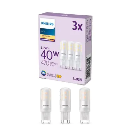 Lot 3x Philips LED Capsule G9 Dépolie 3.7W 470lm - 827 Blanc Très Chaud est une ampoule LED G9 Philips qui vous convaincra non seulement par sa puissance particulièrement efficace de 3.7 watts, mais aussi par une longue durée de vie de 15000 heures. Le prix comprend aussi une garantie de 2 ans.