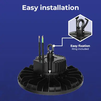 Vous pouvez aussi choisir vos high bay LED en fonction de leurs angles de diffusion du faisceau lumineux, pour les adapter selon vos besoins. Ce luminaire a un angle de faisceau de 120°.
