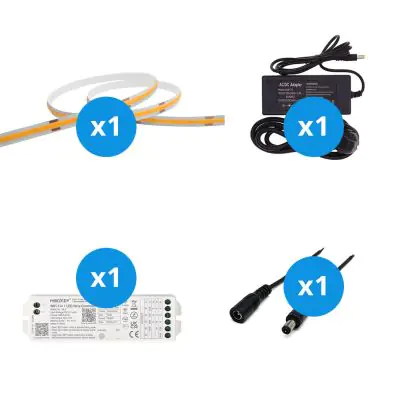 Le grand avantage de cet kit complet est qu'il comprend tous les accessoires nécessaires pour installer le ruban LED dans votre maison ou vos locaux professionnels. Nous vous fournissons la matériel nécessaire pour l'installation du ruban LED. Ensuite, vous branchez le tout sur une prise électrique standard. Vous trouverez toutes les informations nécessaires dans notre blog sur l'installation. Ce kit comprend :
