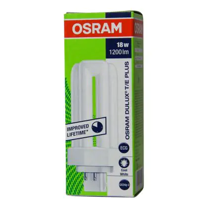La référence Osram Dulux T/E Plus 18W 840 | Blanc Froid - 4-Pins est une lampe fluorescente compacte à 4 broches. Ce produit est conçu pour fonctionner avec un ballast. Sa technologie fluorescente lui assure une grande efficacité en termes de résultats. Un avantage de ce produit est sa durabilité, il possède en effet une durée de vie moyenne d'environ 20000 heures.