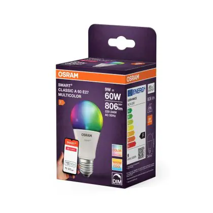 Description Osram Smart+ Classic LED E27 Poire Dépolie Multicolour RGBW 9W 806lm - 827-865 Variable Blanc | Zigbee Dimmable - Équivalent 60W