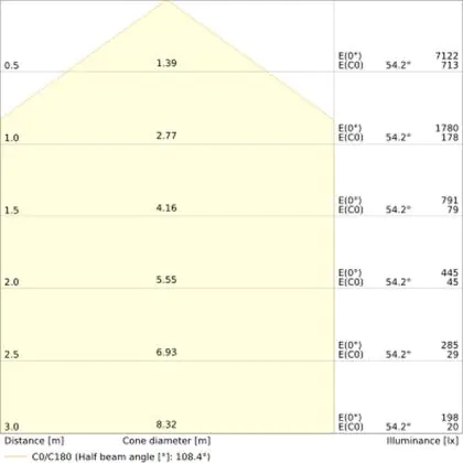 De lichtopbrengst (Lumen), geeft weer hoe krachtig het uitgestraalde licht is. Dit is belangrijk om te weten om de juiste sfeer te creëren. 0 tot 400 Lumen is bij uitstek geschikt voor accent- of sfeerverlichting. Een hoger aantal Lumen is, afhankelijk van de grootte van de ruimte, beter geschikt als ondersteunende- of basisverlichting. Heb je plafonds hoger dan 4 meter, dan is een lichtopbrengst van minimaal 8000lm aan te raden indien heldere verliching gewenst is (vb. in werkomgevingen).